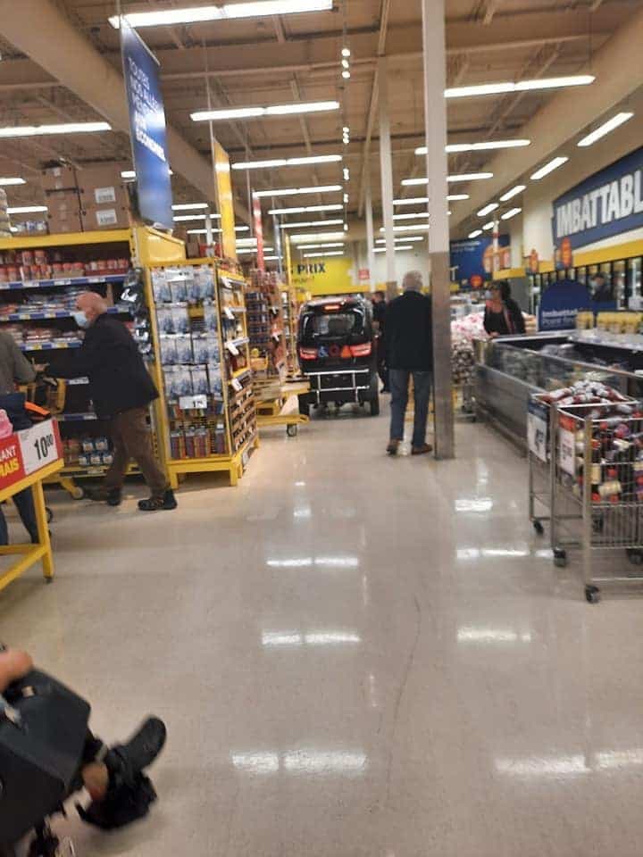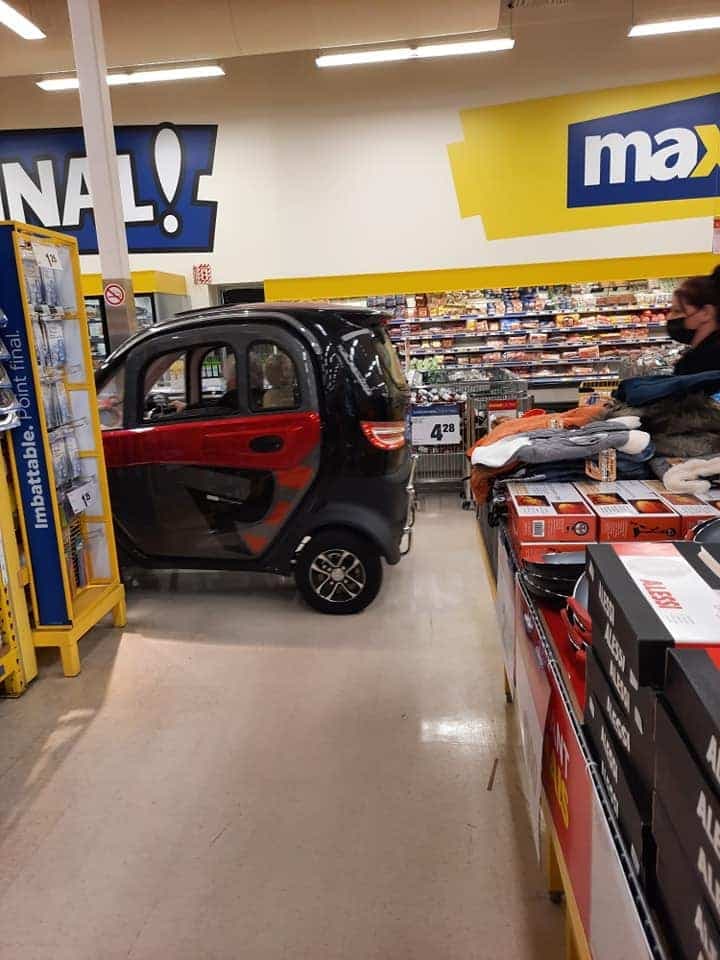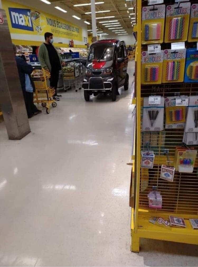 Les clients sur place ont eu la surprise de voir ce qu’on pense être une cliente (mais puisqu’on n’est pas certains, on va garder ça pour «une personne»...) en train de faire ses commissions à bord d’une petite auto semblable à une Smart, mais qui était en réalité un quadriporteur électrique.