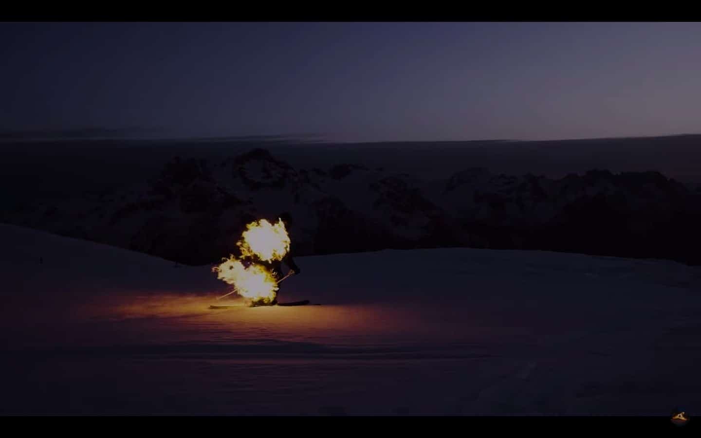 S’enchaîne ensuite la descente spectaculaire du skieur, véritable boule de feu dans un décor sombre et enneigé, qui termine finalement son parcours dans une grotte de glace.