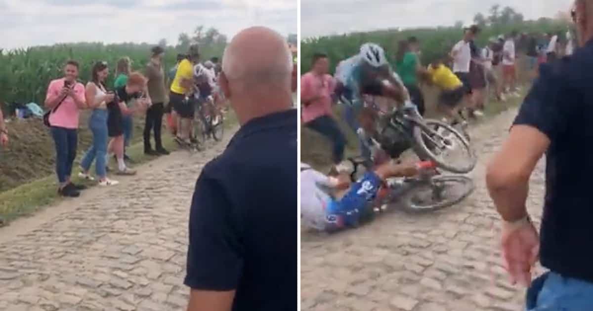 Le cycliste de 35 ans faisait partie du peloton lors de l’étape reliant Lille à Arenberg lorsque le spectateur imprudent, qui filmait les coureurs avec son téléphone, s’est retrouvé droit devant lui après une légère perte de contrôle.