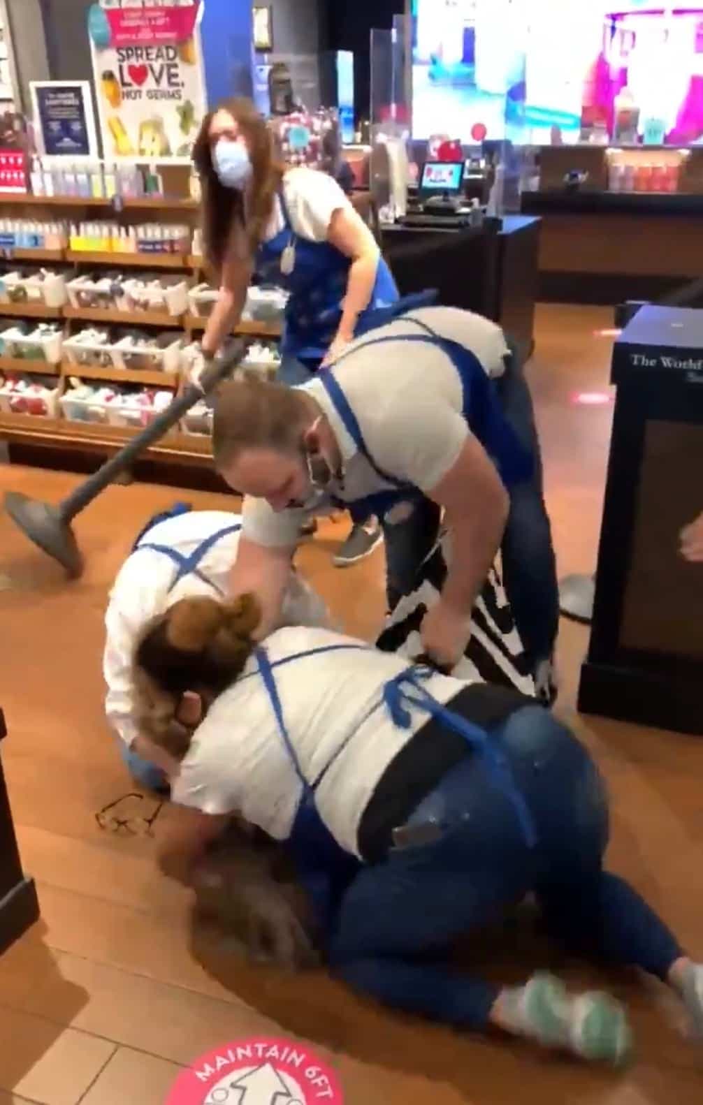 Les employés ont été entraînés malgré eux dans l’altercation violente. Un employé a dû s’en mêler pour mettre dehors les clients problématiques, sous le regard horrifié des gens qui souhaitaient simplement se procurer des bougies qui sentent les biscuits.