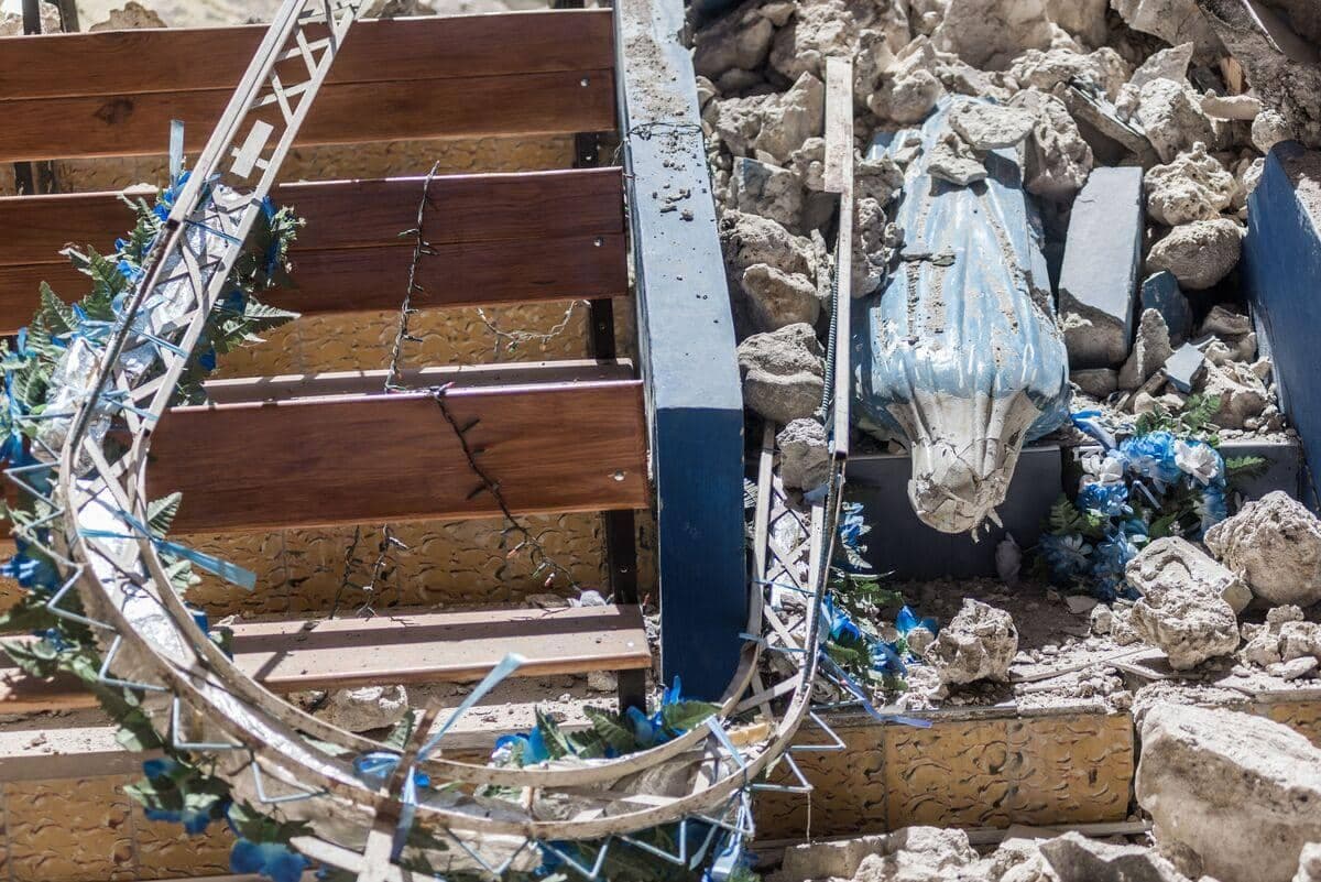 Dans la paroisse Immaculée Conception, tous les corps des victimes ont été retirés des ruines. Les bancs en bois gisent encore dans l’église, enchevêtrés dans les pierres qui composaient le clocher.