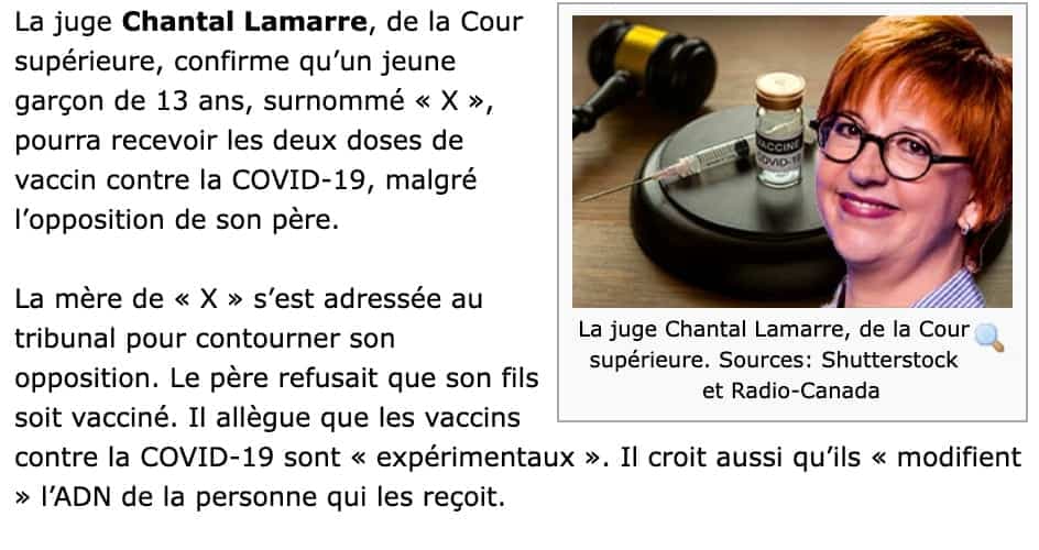Dans le texte, portant sur une décision d’un cas impliquant un garçon de 13 ans et son désir de se faire vacciner malgré l’objection de son père, on mentionne une juge nommée Chantal Lamarre (on allait apprendre plus tard que la juge se nommait véritablement Chantal Lamarche).