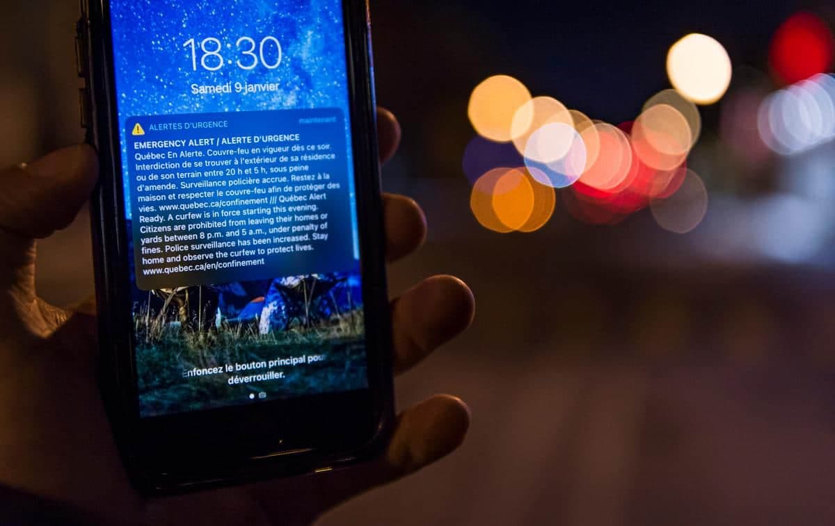 «Québec En Alerte. Couvre-feu en vigueur dès ce soir. Interdiction de se trouver à l’extérieur de sa résidence ou de son terrain entre 20h et 5h, sous peine d’amende. Surveillance policière accrue. Restez à la maison et respecter (sic) le couvre-feu afin de protéger des vies [...]», était-il affiché sur les écrans des cellulaires des Québécois.