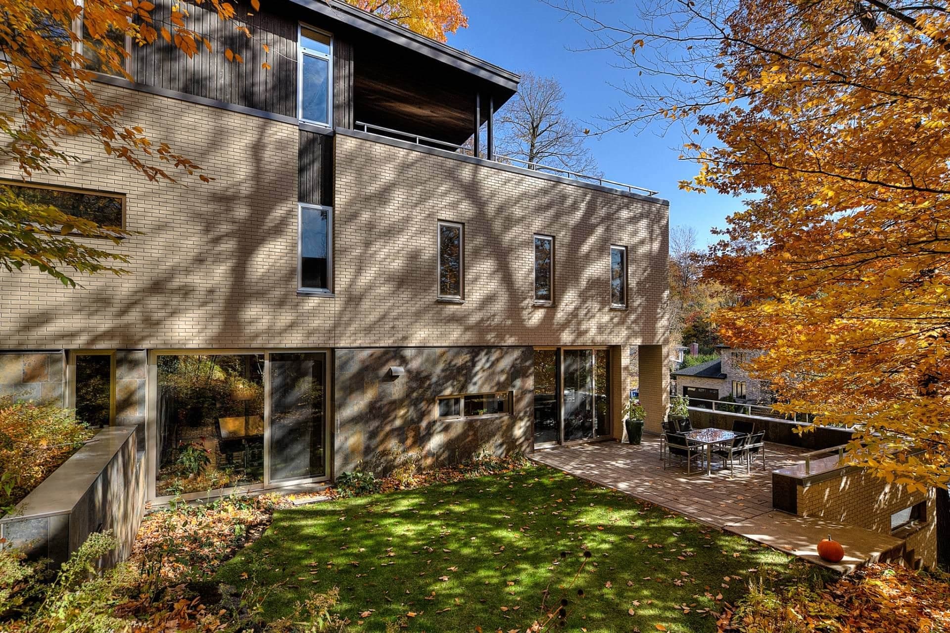La résidence a été réfléchie de manière à s’harmoniser avec le terrain escarpé et boisé sur lequel elle sise. Elle est donc entourée d’arbres centenaires et bénéficie d’une fenestration qui offre de magnifiques points de vue sur la nature.