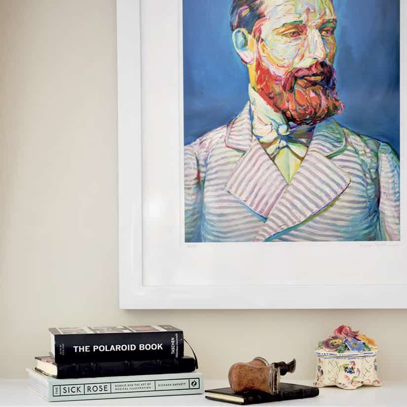 Les portraits d’hommes à barbe sont une autre passion du proprio; on en trouve partout dans la maison, dont ici, au-dessus de la cheminée.