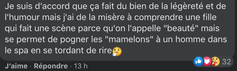 Dans le sauna, Brigitte s'est entre autres étendue, la tête sur les cuisses de Sylvain. Puis elle lui a touché la poitrine dans le spa, tout ceci sous le couvert de l'humour.