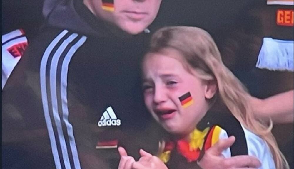 Alors que son équipe nationale affrontait l’Angleterre en huitième de finale le mardi 29 juin, un but des Anglais à quatre minutes de la fin est venu anéantir les espoirs des Allemands. La caméra s’est alors posée sur une petite fille d’environ 10 ans qui versait quelques larmes de déception dans les bras de son père (voir image ci-dessus).