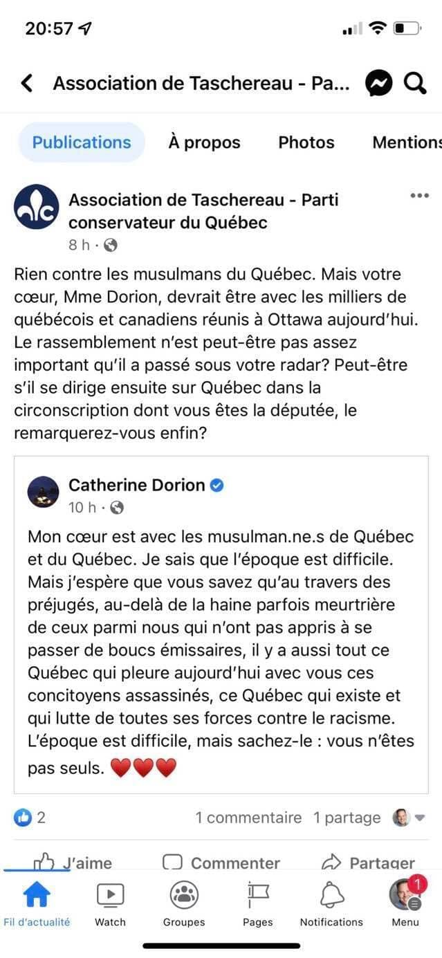 Une personne qui possède un accès d’administrateur à la page Facebook de l’Association de Taschereau du Parti conservateur du Québec a cru bon ajouter son grain de sel en faisant un drôle d’amalgame entre l’attention portée par la députée qsiste au convoi de camionneurs s’étant rendu à Ottawa pour manifester contre les mesures sanitaires et à celle qu’elle a accordé au cinquième anniversaire de la tragédie.