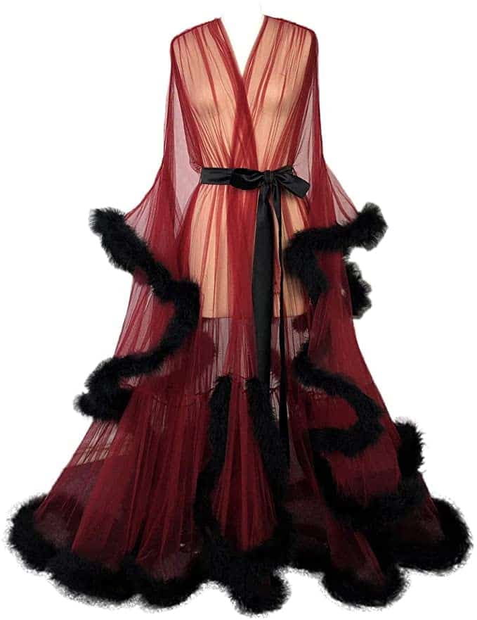 Robe de chambre transparente à plumes noires I DUI Bridal, 145$ chez Amazon