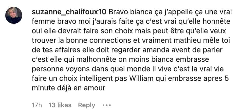 Elle est revenue voir Mathieu et l’a affronté en revenant sur ses propos. Ce dernier est allé chercher tous les gars pour qu’ils puissent répéter à Bianca ce qu’ils avaient dit dans son dos.