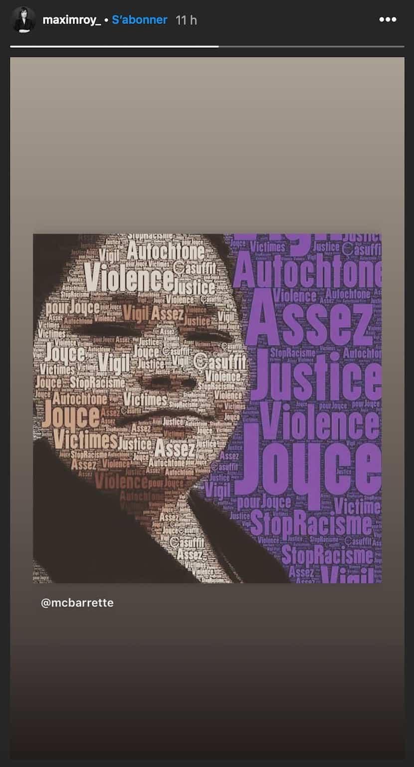 Depuis ce terrible événement, de nombreuses voix s'élèvent pour dénoncer le traitement réservé aux femmes autochtones, ainsi que, de manière plus large, le racisme envers les autochtones ici même, au Québec. Dans les dernières heures, de nombreuses vedettes québécoises ont choisi de profiter de leur plateforme pour dénoncer ces injustices, que ce soit en partageant des illustrations en sa mémoire, des articles ou même le lien vers la campagne de financement pour venir en aide à sa famille.
