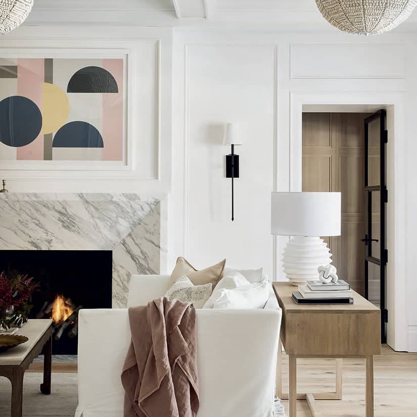 Aménagement Lauren Woods, designer, Lauren Woods Interiors • Causeuses Elte • Console Four Hands • Suspensions RH Baby & Child • Habillage du foyer Lauren Woods Interiors • Tapis Serena & Lily • Parquet Chestnut Flooring