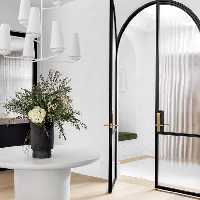 Les arches naturelles en plâtre de l’escalier ont influencé de nombreuses autres décisions de conception, à commencer par celle des arches qui ont été intégrées au salon ainsi que des meubles sur mesure qui s’y nichent. La finition murale en plâtre vénitien, qu’on retrouve dans toute la maison, apporte une touche d’élégance supplémentaire.