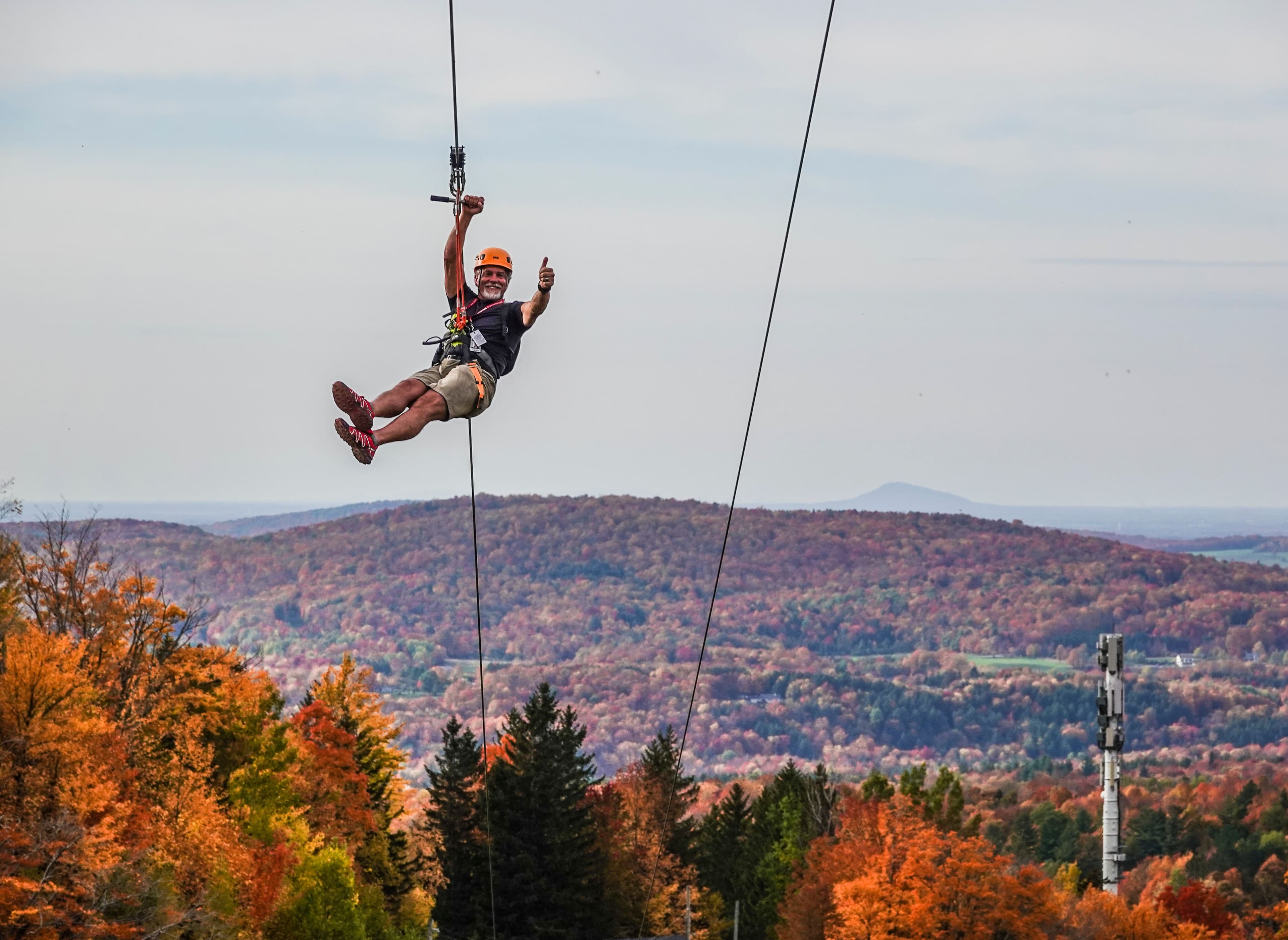 À Sainte-Agathe-des-Monts, on grimpe un flanc abrupt du mont Catherine par une via ferrata, faite de câbles, d’échelles et de prises. Une fois au sommet, on a accès à quatre tyroliennes géantes de 600 à 900 mètres de long.