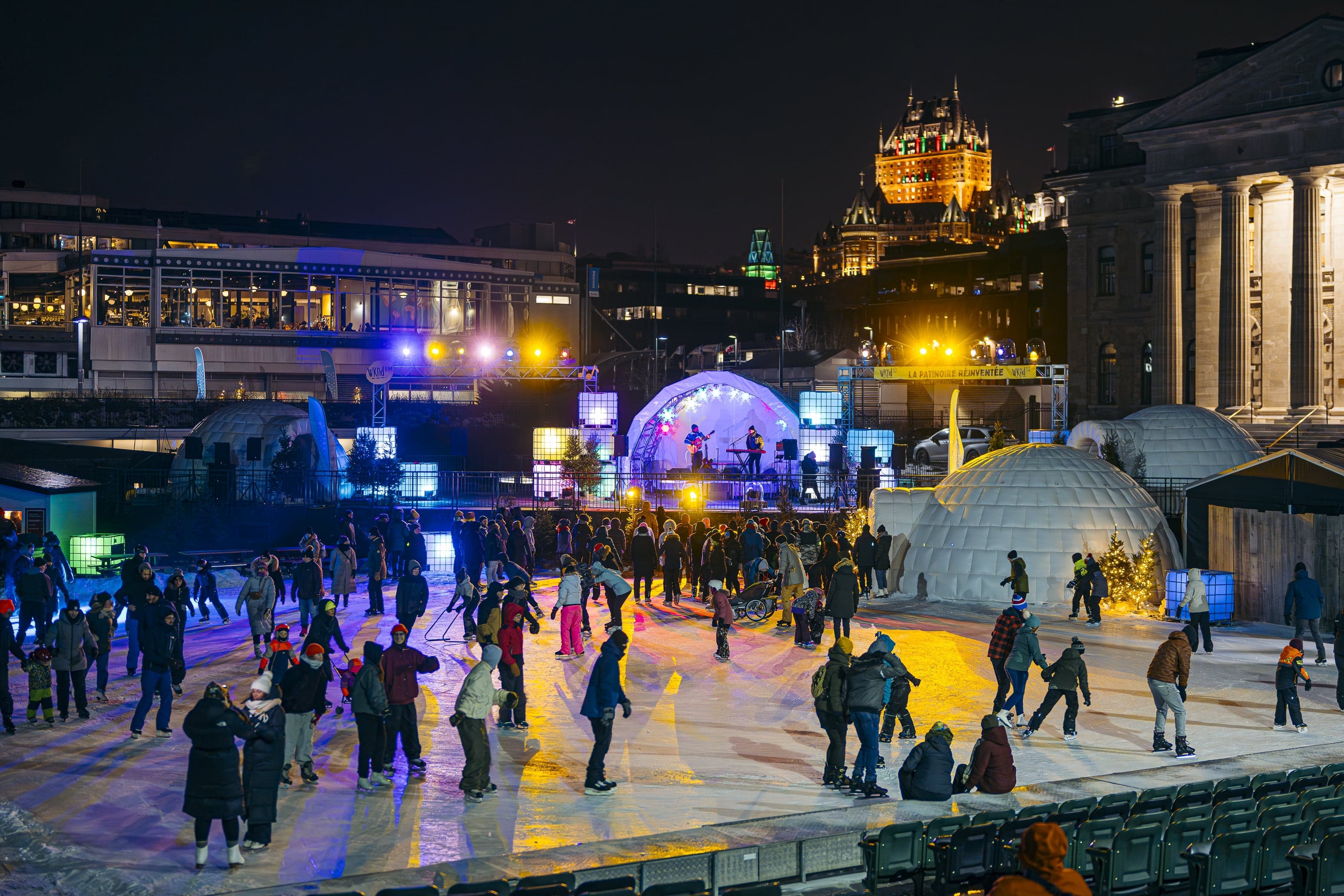 L’Agora du Port est devenue une vaste discothèque glacée avec animation et jeux de lumière. Décor nordique. Igloos pour une halte au chaud. Superbe point de vue sur le Château Frontenac.