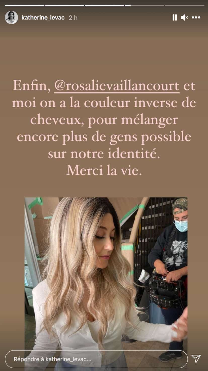 Sur les images, on peut voir que Katherine Levac a elle aussi changé de tête pour son rôle, bien qu'il ne s'agisse pas, de son côté, d'un changement permanent. L'humoriste a partagé une photo sur son compte Instagram, en story, où elle fait un clin d'oeil à ceux qui la confondraient avec sa meilleure amie, Rosalie.