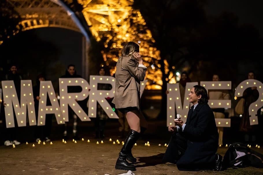 Eh oui, c'est par l'entremise de ses réseaux sociaux qu'il a partagé la grande nouvelle en publiant un magnifique montage vidéo de l'impressionnante demande qui s'est déroulée à Paris, avec pas moins de 200 chandelles, et ce, juste devant la tour Eiffel.